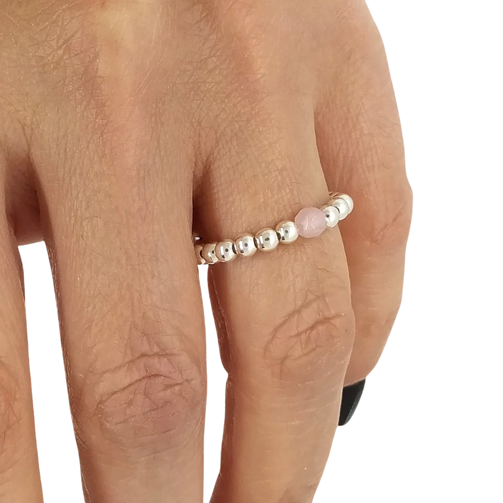 Material: cuentas de plata #3, 1 cuenta de piedra #4 cuarzo rosa, tanza elastizada.