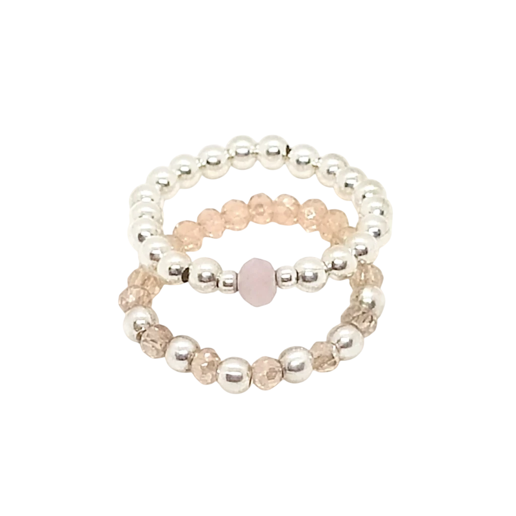 1 anillo de cuentas de plata #3 con cristal #4 rosa pálido, 1 anillo de cristal #2 salmón transparente con cuentas de plata #3