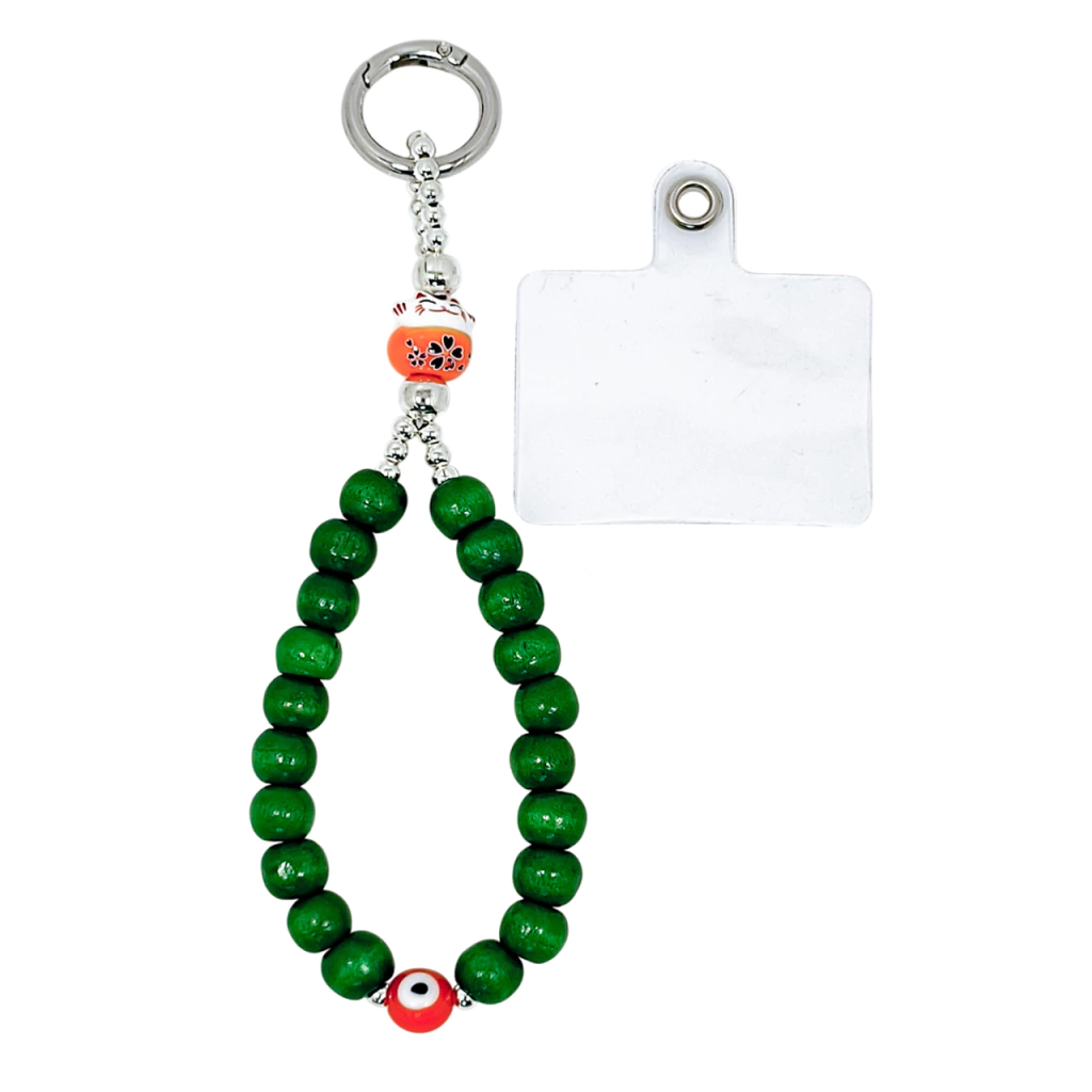 > Material > madera + metal bañado + ojoturco de vidrio + Maneki Neko cerámica.