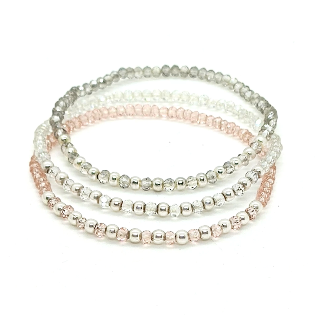 1 pulsera pecas cristal #2 salmon con cuentas #3 de plata 925, 1 pulsera pecas #2 transparente con cuentas #3 de plata 925, 1 pulsera pecas cristal #2 grison con cuentas #3 de plata 925