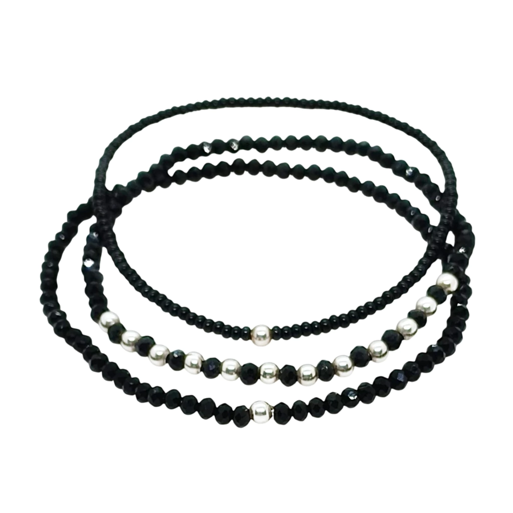 1 pulsera cristal #2 negro, 1 pulsera pecas cristal #3 con cuentas de plata #3, 1 pulsera checa negra
