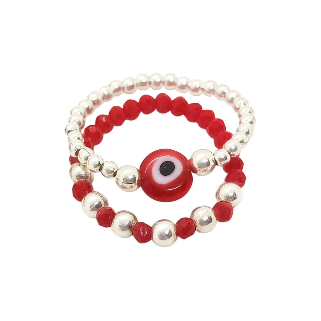 1 anillo de cuentas de plata #2 con ojo turco rojo, 1 anillo de cristal #2 rojo con cuentas de plata #3
