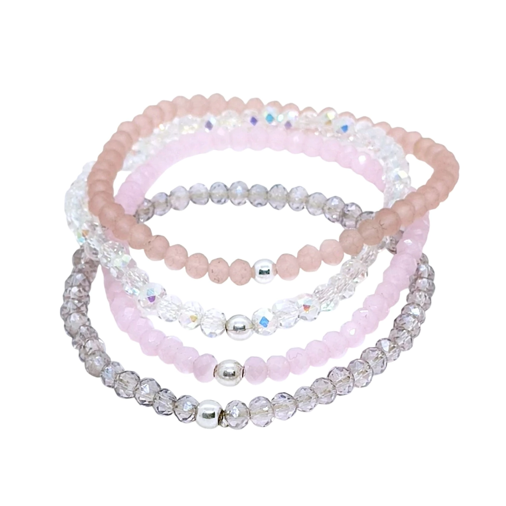 1 pulsera de cristal #4 plateada con tonos lilas, 1 pulsera de cristal #4 nude, 1 pulsera de cristal #4 rosa pálido, 1 pulsera de cristal #4 morado opaco