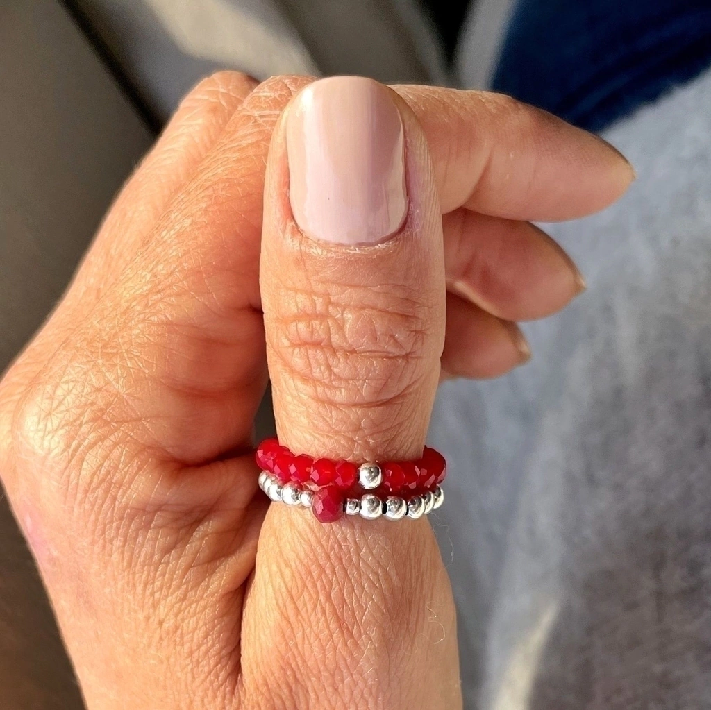 1 anillo con cuentas de plata #3 c/ cuenta de cristal rojo esmerilado #4 +1 anillo cristal rojo #2.