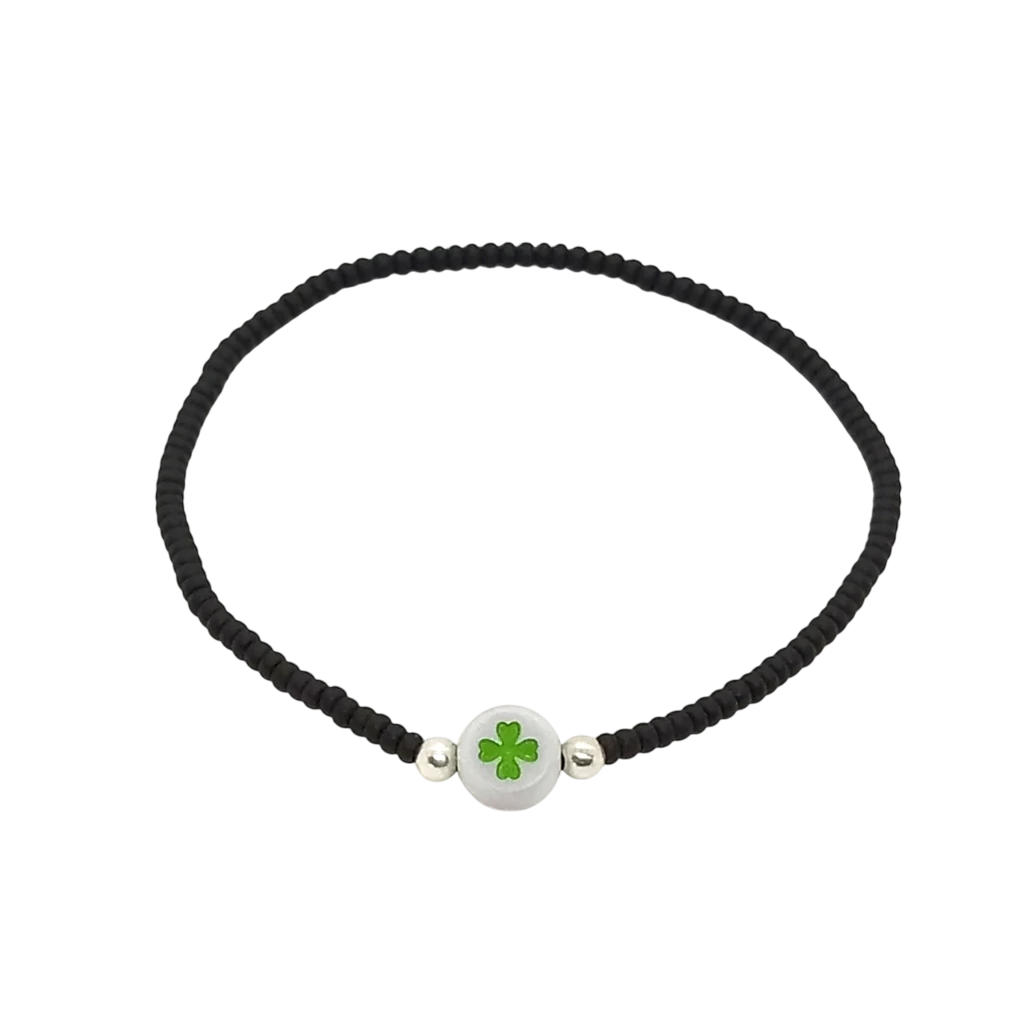 Material: mostacillas checas + cuenta acrílica con trébol + cuenta de plata + tanza elastizada.